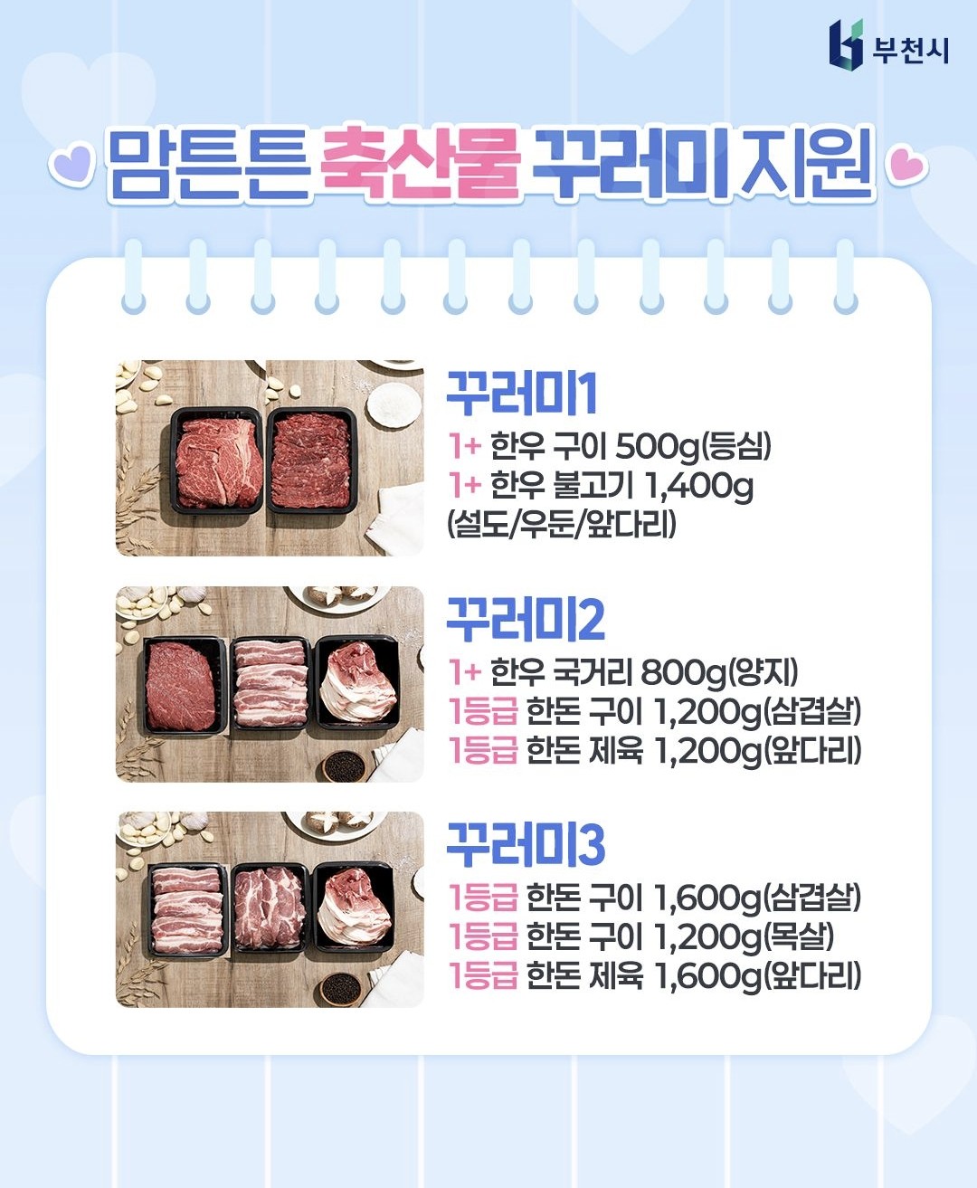부천시는 10만 원 상당의 국내산 축산물 꾸러미(1~3번 중 택 1) 를 제공합니다.
