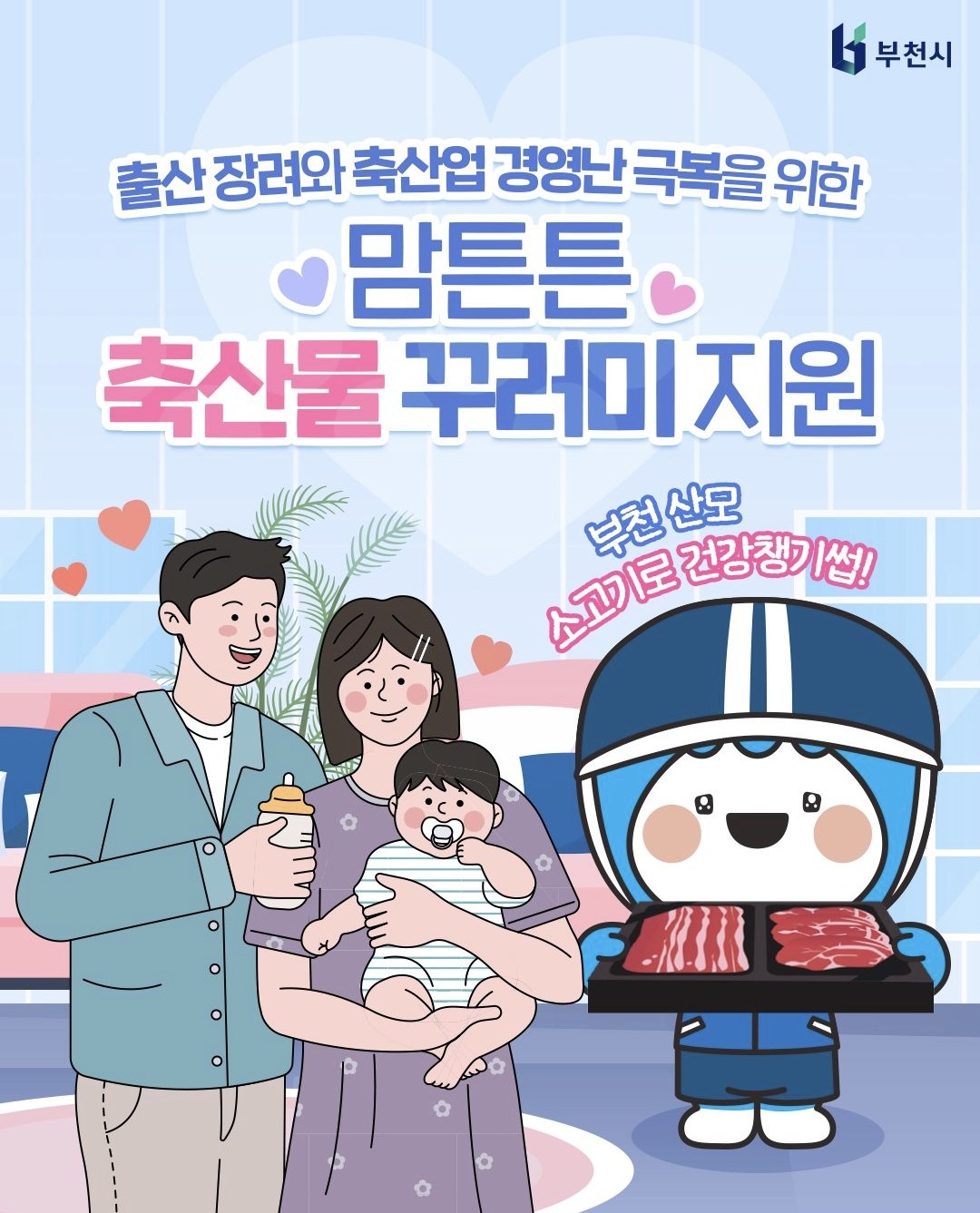 부천시는 출산을 축하하고 축산업의 활력을 높이기 위해 ‘맘튼튼 축산물 꾸러미 지원 사업’을 시행합니다.