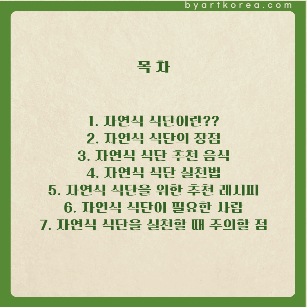 ⚠️ 너무 급격한 변화는 피하기: 기존 식단에서 서서히 자연식 식단으로 전환하는 것이 중요합니다.
